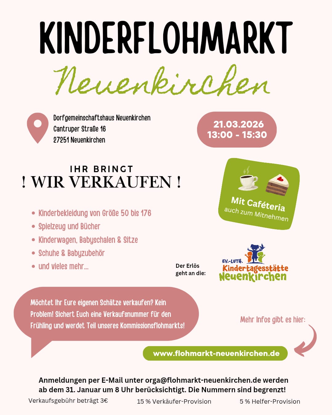 Anmeldungen ab 31.01.2026 um 8 Uhr unter orga@flohmarkt-neuenkirchen.de